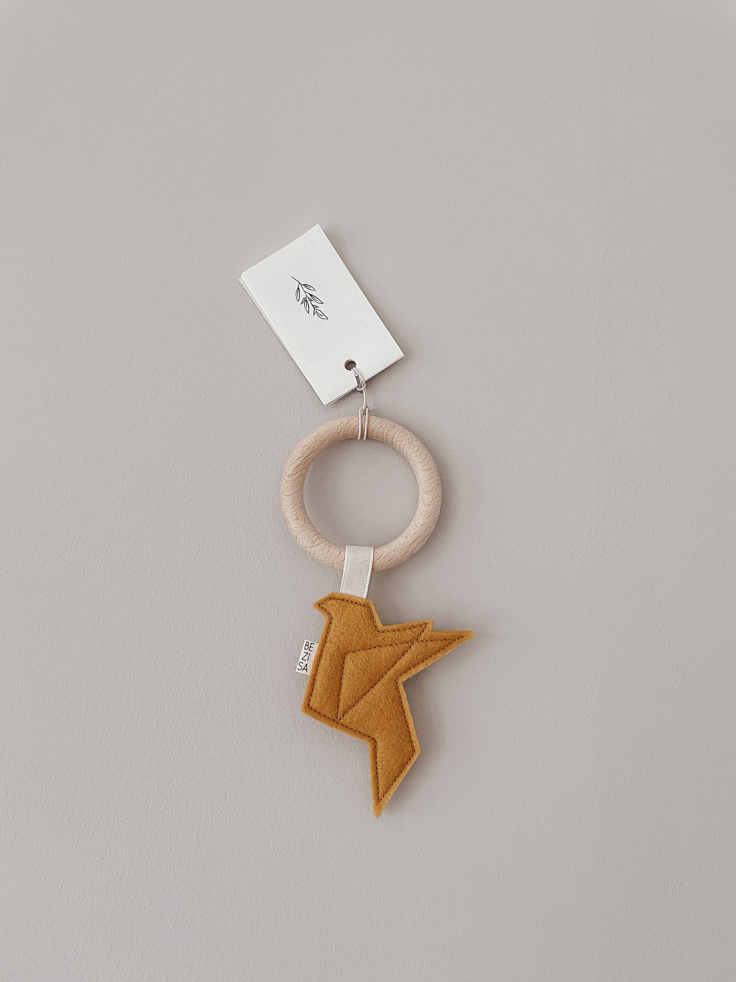 De bijtring is gemaakt van een houten ring en een figuurtje van ecologisch wolvilt. De houten ring heeft een doorsnee van ongeveer 7 cm. Het wolvilt is gekleurd met natuurlijke materialen. Veilig bijten en kwijlen dus. Tips voor langer behoud van de kwaliteit zie de veiligheidsvoorschriften.