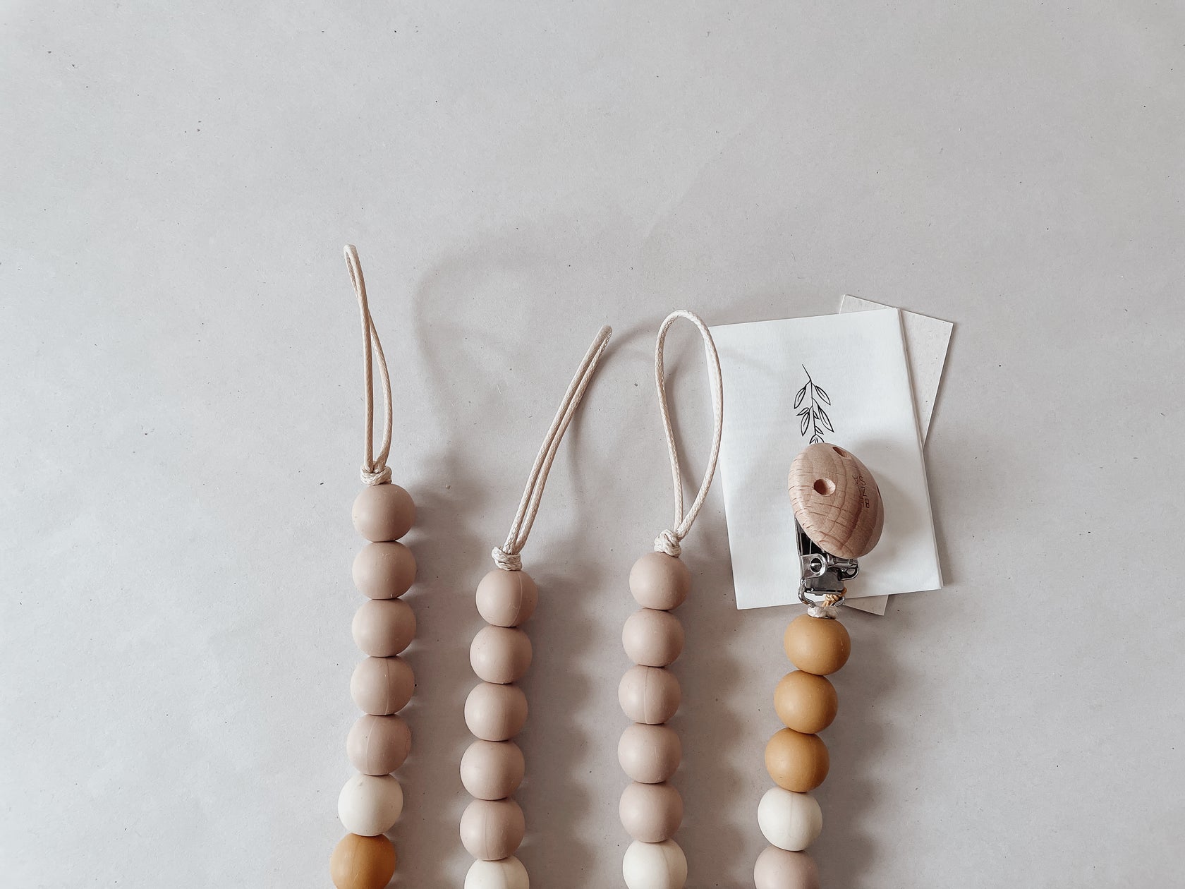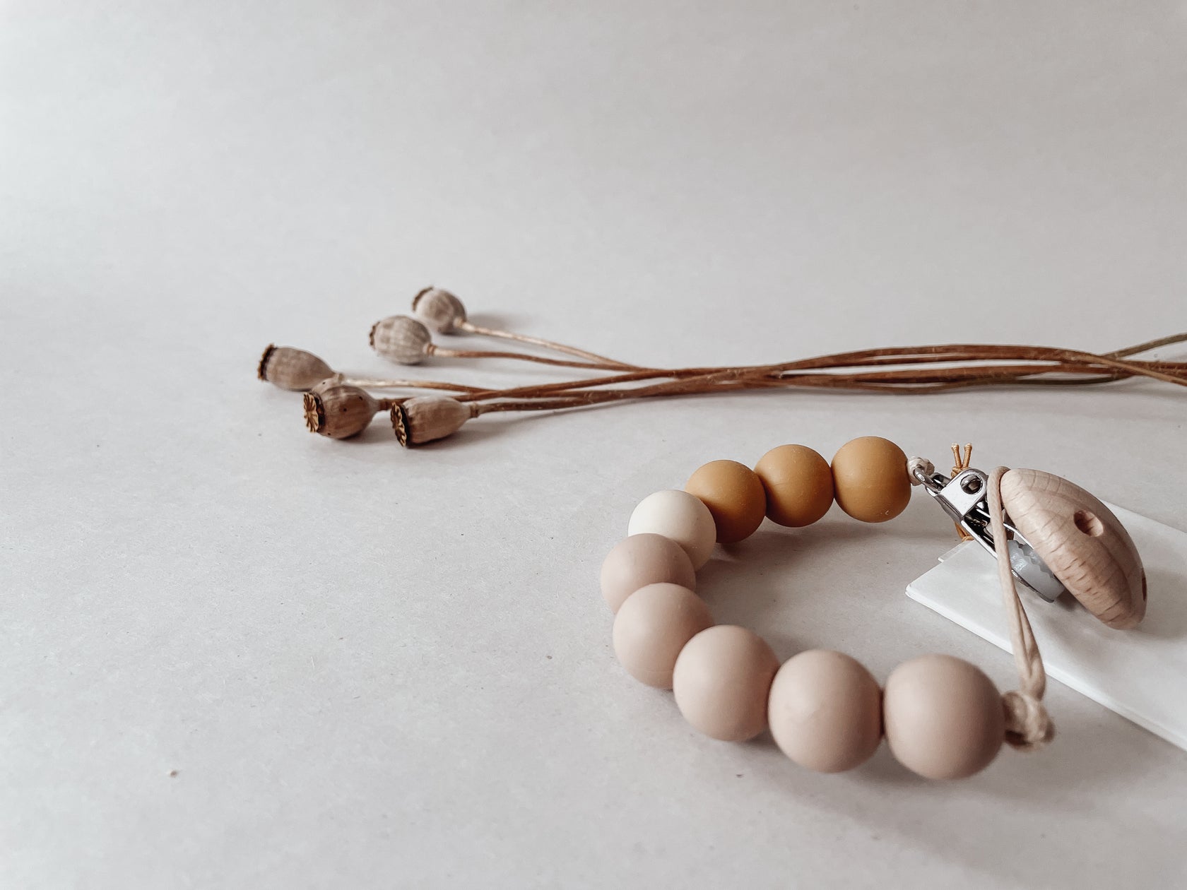 De kralen zijn gemaakt van 100% siliconen. Siliconen zijn voornamelijk gemaakt van het basiselement silicium (kiezel) en zuurstof. Beter bekend als kwarts en in kleine vorm, het hoofdbestanddeel van zand. 12% van wat er op en in de aardkorst te vinden is bestaat uit kwarts. Dit is het meest voorkomende mineraal op aarde. Als er aan kwarts carbon en waterstof wordt toegevoegd, onstaat er door lange ketens van silicamoleculen elkaar te koppelen, silicone. Een rubberachtig, onbreekbaar materiaal, dat vele voordelen kent, en zeer een lange levensduur heeft.
